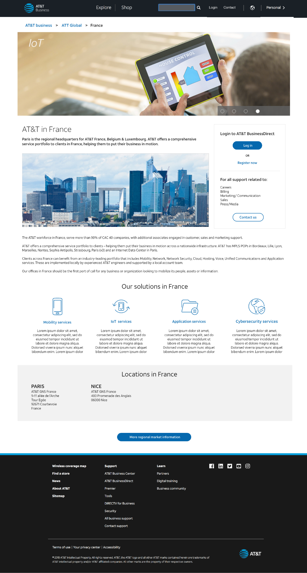 Simple and dirty sketching in Invision to show the stakeholders how the global presence of AT&T business can be addressed that would increase the findability and enable the international customers to reach out to their local and regional contact for any additional business support that they might have. Individual regional pages to showcase the presence of AT&T in the different countries and cities and what products and services are available to the customers.